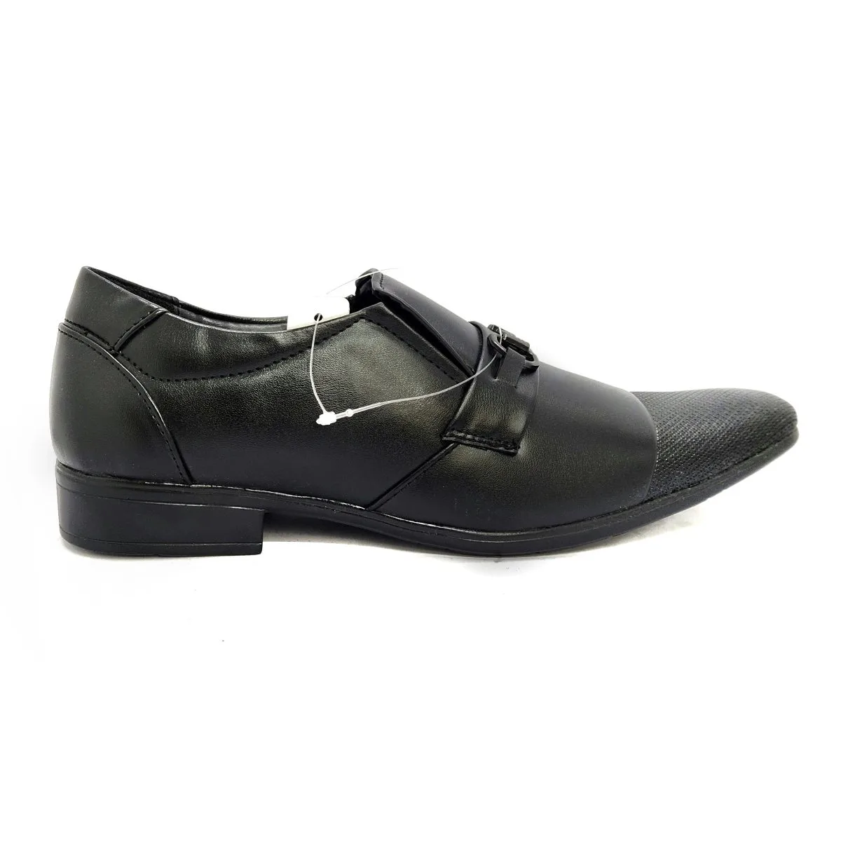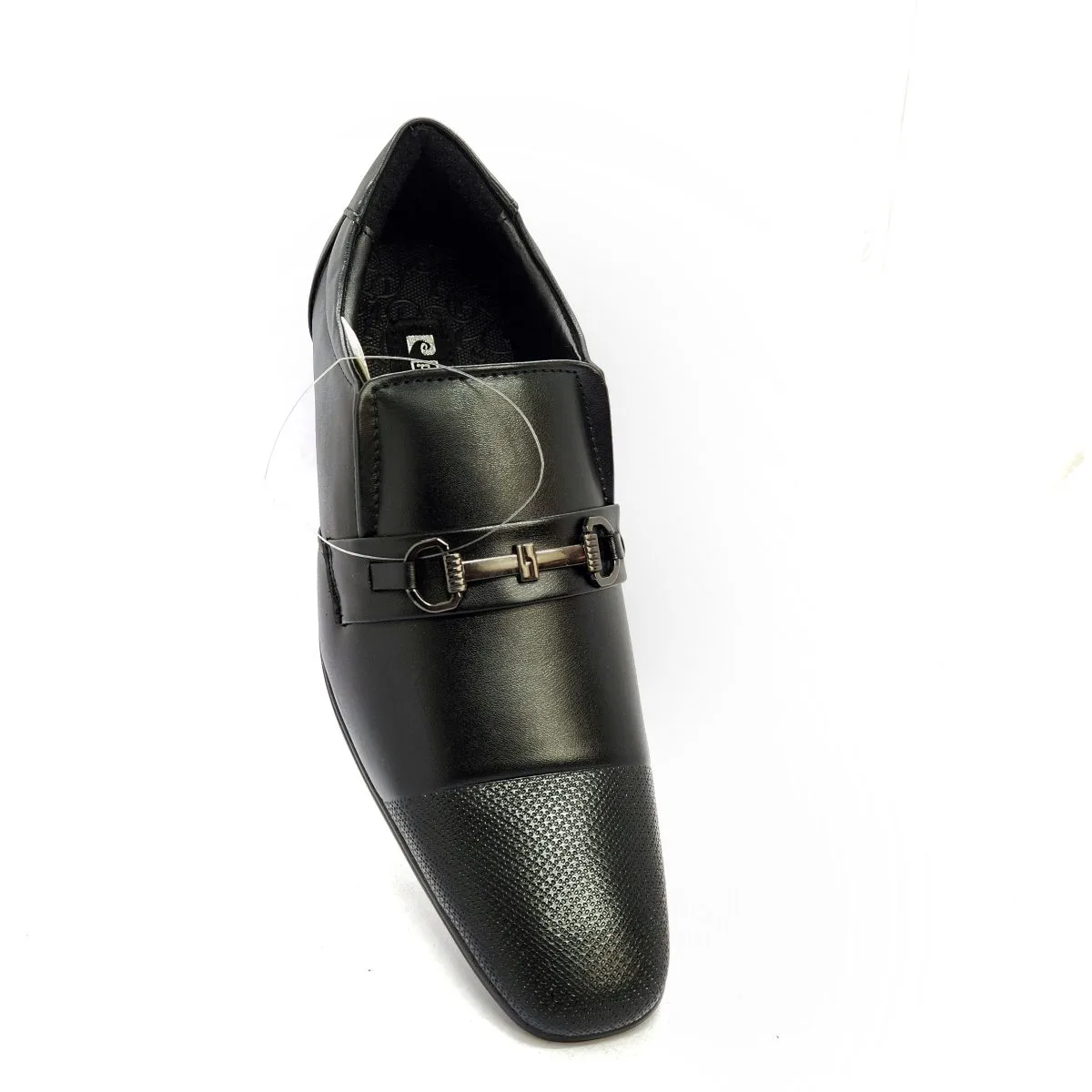 Achieve a distinguished, contemporary look with this Pierre Cardin black formal slip-on shoe. Featuring a sleek PU leather upper with an elegant metal monk strap accent and a modern textured toe cap, this shoe is perfect for sophisticated business and event wear.