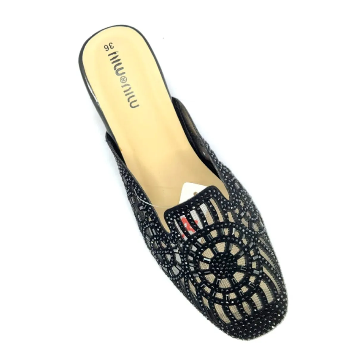 Add glamour to your evenings with this black embellished mule slipper. Featuring intricate net and stone-work over a synthetic upper, a comfortable low heel, and a durable TPR sole, this shoe offers a dazzling and elegant slip-on option for parties and special occasions.